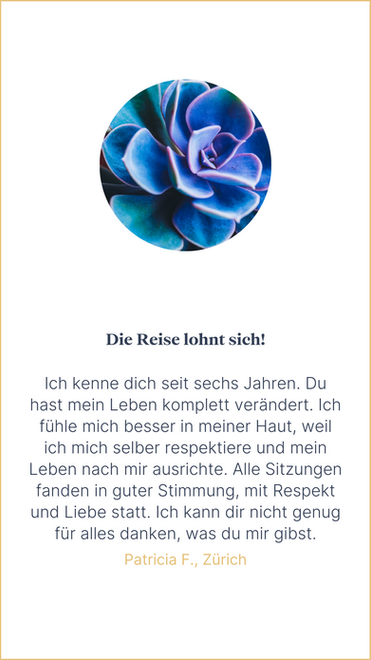 Mein eigener Weg führte mich durch verschiedene Lebensthemen, begleitet von zahlreichen liebevollen Menschen, denen ich zutiefst dankbar bin. Mithilfe verschiedener Methoden konnte ich tiefgreifende Transformation, Heilung und persönliche Entwicklung erfahren. Dieser Erfahrungsschatz fliesst heute in meine Arbeit ein und befähigt mich, Zusammenhänge wahrzunehmen.